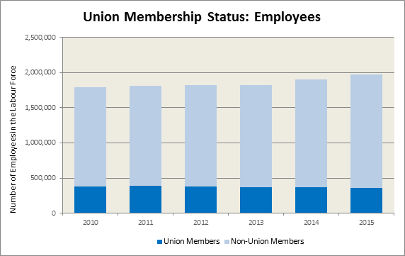 Based on the returns received by the Ministry of Business, Innovation & Employment up to 31 August, total union membership as of 1 March 2015 was 359,782. This represents 18.3% of employees. Total union membership decreased by 1.4% compared with the previous year.